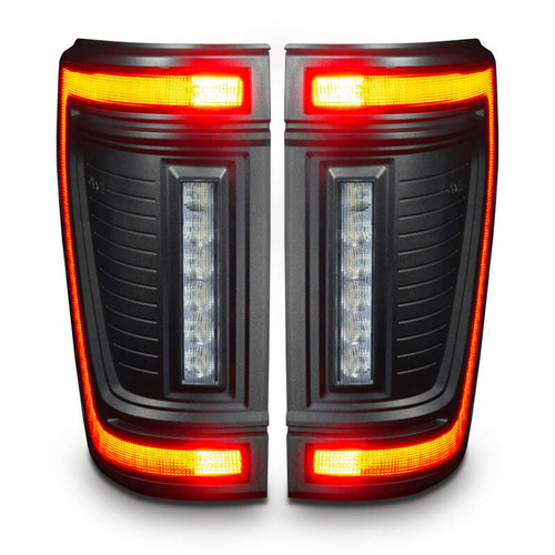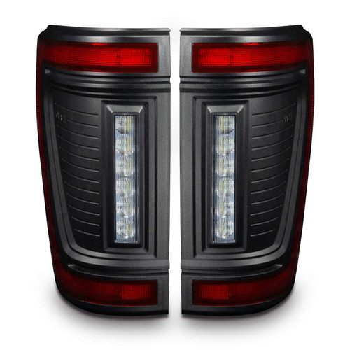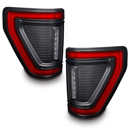 Protruding out significantly less than the factory tail lights, this low-profile design has a more streamlined appearance while also reducing the risk of tail light damage. These flush tail lights feature a unique modular design and functional LED lighting elements including high-powered reverse lights, unique signature perimeter lighting, and an animated turn signal sequence. No more problems backing up at night and no longer do you need to install additional reversing lamps onto the back of your truck to get the brightness you desire. That's because these LED reverse lights are basically a pair of LED light bars mounted into the tail light which will provide over 4,400 Lumens of rear-facing illumination! In addition to the attractive ?signature style LED lighting band and the high-output reverse light this design also features a ?dynamic turn signal effect. This ?motion or ?sequential effect is a fluid LED motion from the inside portion of the light to the outside portion of the light signifying the direction of the turn signal with a fluid animated LED sequence. These lights include wiring adapters which make them compatible with all F-150 models from 2021-2024 with or without the factory LED Option (halogen lights) and with or without the factory BLIS cross-traffic sensors. The adapters provide a true plug-and-play option without any other wiring being needed for installation. The factory cross-traffic sensors can be easily swapped over into these new lights with the original factory hardware and using our plug-and-play connectors. The new modular design allows the light to be quickly disassembled for custom painting. The Reverse Light module and Stop/Tail/Turn module can be easily removed from the black housing which can then be painted to match the body color of the vehicle to provide a more customized appearance that more seamlessly blends with the truck.