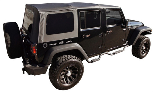 Replace your aging, worn out factory soft-top and gain some additional storage space inside the driving compartment. All the features of the original factory top with exclusive Rampage additions which includes two zippered storage pockets. Produced in original factory specifications and colors. The Rampage replacement top easily installs over factory framework, attaches to factory mounting points and Original Equipment belt rail attachment System. Fits all factory applications. Includes the upper door skins that slip over the OE upper doorframes and tinted windows. For half door applications only.