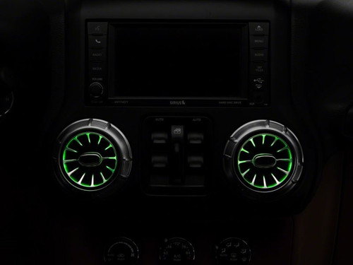 Add unique custom lighting to your JK Wrangler's interior with a Raxiom LED Ambient Vent Lighting Kit. This Kit includes four replacement AC vents that feature integrated multi-color RGB LEDs. With a simple to use one button design you can easily cycle through all the available color options. Manufactured from OEM grade materials, these AC Vents are assembled to precise standards a perfect OE style fit. Featuring an attractive, gloss silver finish, these vents can be positioned in any of 360 degrees. Raxiom designed their LED Ambient Vent Lighting Kit to be straight forward to install. However, it will require removing a number of dash panel components, so professional installation is recommended.