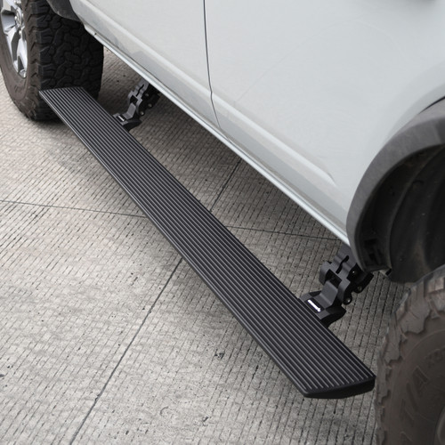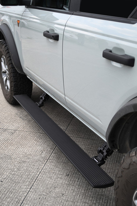 RealTruck VoltStep Electric Running Boards allow you to step in and out of your truck, Jeep, Bronco or SUV with ease. Open your door and the VoltStep automatically deploys, providing a secure 6” wide durable aluminum running board with an anti-slip surface. For additional safety and security, the integrated LED lights turn on automatically when the board deploys. Close your door and VoltStep automatically retracts, providing your vehicle with optimal ground clearance and protection for its rocker panel while preserving the look of your vehicle. With dual motors on each board, Go Rhino's electric running boards are reliable even in extreme climates. The easy-to-install, magnetically-activated door switches leave your OBD port free for other accessories. Automatic safety stop and manual override capabilities are included. Boards are finished with a Textured Black Powder Coat and have black nylon endcaps. The VoltStep Electric Running Board Kits come with a Limited Lifetime warranty on materials and construction and a 5 year warranty on the Textured Black finish.