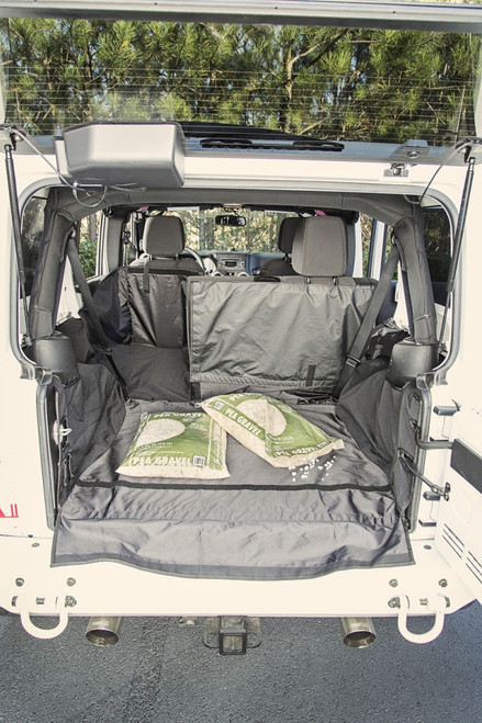 A versatile Jeep deserves versatile accessories. Keeping you on the-go with ease, the patent pending rear Configurable Cargo Covers (C3)offer complete protection for the rear cargo area of your Jeep. By protecting the carpet and plastic trim from damage, scratches, pet claws, dirt, and other debris, it'll stay looking pristine through all your daily tasks. No mess, no stress! A custom made and functional accessory for 2007 to current JKs, this unique design also allows for a pet friendly space, ideal for your pet to rest during long off-road trips. Featuring water resistant material, the split fold feature allows for 40-60 rear seat lowering, and provides coverage with your rear seat up, partially or fully lowered-- flexible and functional! A flip out cover flap keeps dirt from falling into the rear tailgate door gap. The built-in front curtain wall helps to keep items and pets from entering the front seat area. A unique side retention system insures the cover stays securely in place as you load or un-load. Easy to install and remove so you get protection when and where you need it. Rugged Ridge C3 Rear Cargo Covers, ready for whatever.