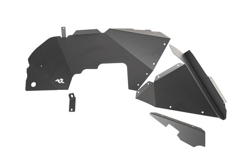 Rugged Ridge Aluminum Inner Fender Liners are a crucial element to building your off-road beast. Crafted from lightweight 1/16- in. aluminum, CNC laser cut and bent for a perfect fit, these inner fenders protect your engine compartment from mud and debris and look phenomenal doing it. Designed to work with trimmed OE flares and most aftermarket fenders, these inner fenders give you that additional clearance you're looking for when running bigger tires. Integrated splash shields offer full coverage that surpasses the flimsy factory liner, while a durable black powder coated finish makes sure things remain stunning, even under layers of mud & muck. Rugged Ridge Aluminum Inner Fender Liners install easily using factory mounting locations with no drilling required.
