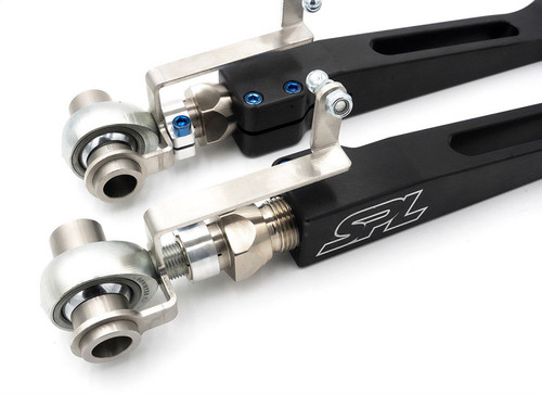 S550 Mustang Front Lower Control Arms (FLCA) provide roll center, camber, and track width adjustment for the S550 Ford Mustang, and allow for full articulation with the proper ball joint angle. The main arm is slotted to allow the use of pinch bolts, and our rotating clamps on SPL Parts' exclusive Double Adjuster lock down camber and track width settings. No more jam nuts!! Long gone are the days of fumbling with multiple wrenches to tighten jam nuts in place while trying to keep your bearings oriented correctly. Our Double Adjuster is machined from 4130 Chromoly, gun drilled to reduce weight, then electroless nickel plated for corrosion resistance. Blue Anodized Titanium hardware shaves even more unsprung weight from the arms without compromising strength. Stainless Steel spacers are provided to correct roll center for lowered vehicles