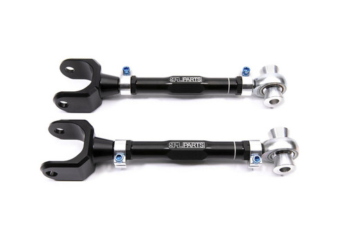 SPL rear toe arms increase stability and response by eliminating bushing deflection while providing an increased range of rear toe adjustment, necessary for lowered cars or for performance alignments. Easily set your desired toe angle by turning the 2024-T351 aluminum turnbuckle and tightening the two 6061-T6 aluminum clamps via titanium 5/16” Allen head cap bolts to lock it down. No more juggling wrenches trying to perfectly tighten down jam nuts! SPL toe arms utilize American made FK rod ends with a self-cleaning, high load capacity bearing within a PTFE-lined race which allows the suspension to freely articulate without significant bushing bind. Sold as a pair, one set needed per vehicle. Made in the USA. NOTE: If you have installed the Ford Performance Bushing in the knuckle in the Toe Arm location, you will need to contact us first to get a part with proper fitment.