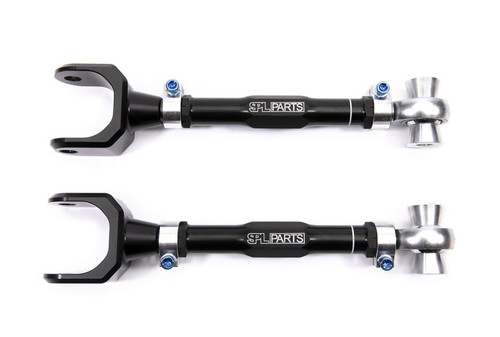 S550 Mustang Rear Toe Arms (RTA) increase stability and response by eliminating bushing deflection while providing an increased range of rear toe adjustment, necessary for lowered cars or for performance alignments. Even small changes to ride height and camber will affect toe settings, and the wide range of adjustment allows you to maximize grip on a track car and extend tire life on a street car. The factory rear toe arms utilize an eccentric bolt and washer for adjustment and lack the precision and range that SPL Parts rear toe links offer. Black Anodized and gun drilled 2024 Aluminum main links along with our 360 degree Rotating Clamp design allow for quick and precise adjustment. The Rotating Clamps are tightened with Blue Anodized Titanium Socket Head Cap Screws for easy to access adjustment, and shaves even more unsprung weight, without compromising strength. The stock eccentric bolts that allow for small toe adjustments tend to slip under high cornering loads, causing changes to the rear alignment. Our SPL Parts Eccentric Lockout (EL) kit eliminate the stock eccentric bolts to keep your rear alignment where you set it. Our lockout plates are CNC machined from 6061-T6 Billet Aluminum and supplied with Zinc plated grade 10.9 hardware for absolutely zero-slip. FK Spherical Bearings and Rod Ends are manufactured in Connecticut and utilize a Teflon liner to provide quiet operation, lower friction, smooth articulation, and eliminates bushing deflection under load. The liner is also self-lubricating and self-cleaning, offering robust reliability for street and track use. The PTFE liner is chemically bonded to the inner diameter of the race, and offers a very high load carrying capacity that has greatly increased dynamic wear characteristics. The operating temperature of the liner ranges from -65º