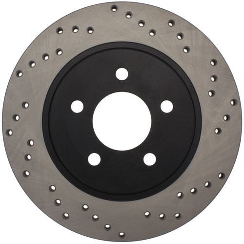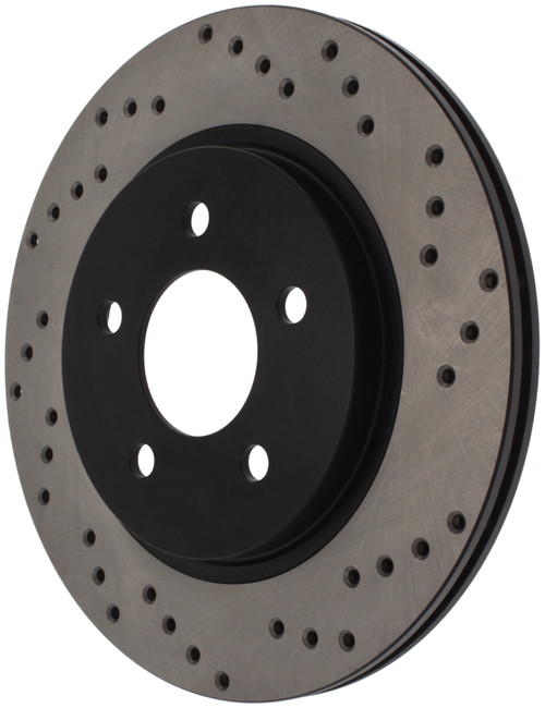 StopTech Drilled Sport Rotors are 1-piece direct replacement brake discs for factory brake systems and stock calipers that look great behind your wheels – and offer significantly improved braking performance. The unique cross-drilling aids with heat and brake dust dispersal; prevents glazing of the pads; adds bite and improves wet and dry braking performance. Built to last; the black e-coating provides protection from corrosion and the high carbon metallurgy (in most applications) offers quieter operation; better crack resistance and increased performance.