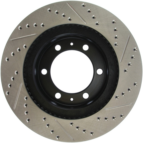 StopTech Drilled and Slotted Sport Rotors are 1-piece direct replacement brake discs for factory brake systems and stock calipers that look great behind your wheels – and offer significantly improved braking performance. The unique cross-drilling and slotting aids with heat and brake dust dispersal; prevents glazing of the pads; adds bite and improves wet and dry braking performance. Built to last; the black e-coating provides protection from corrosion and the high carbon metallurgy (in most applications) offers quieter operation; better crack resistance and increased performance.