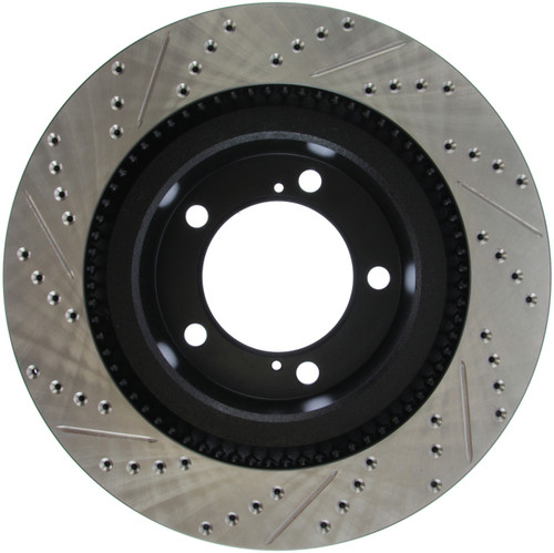 StopTech Drilled and Slotted Sport Rotors are 1-piece direct replacement brake discs for factory brake systems and stock calipers that look great behind your wheels – and offer significantly improved braking performance. The unique cross-drilling and slotting aids with heat and brake dust dispersal; prevents glazing of the pads; adds bite and improves wet and dry braking performance. Built to last; the black e-coating provides protection from corrosion and the high carbon metallurgy (in most applications) offers quieter operation; better crack resistance and increased performance.