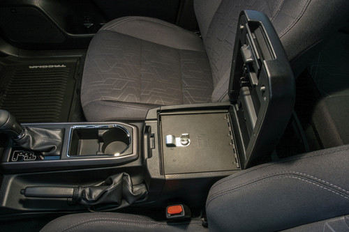 Continuing the Tuffy legacy of designing and manufacturing the finest security console safes in the industry since 1997, Tuffy is proud to introduce our security console safe for the Toyota Tacoma with a fixed center console. This 16 gauge steel console safe provides style, security and convenience. While maintaining the refined curves of the OEM console, the Tuffy console safe transforms your OEM console into a heavy-duty lockable storage area utilizing Tuffy’s Pry-Guard locking system with 10 tumbler double bitted security key to help protect valuables from thieves. The innovative design utilizes an exclusive lid support feature that keeps the lid open while accessing contents. The safe maintains a completely stock look including full use of armrest and lid. Featuring a durable texture powder coat finish, the safe comes ready to install in just a few minutes without drilling.