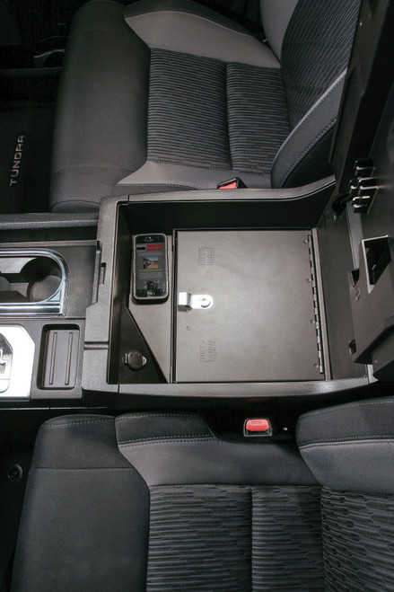 Continuing the Tuffy legacy of designing and manufacturing the finest console safes in the industry since 1997, Tuffy is proud to introduce our new security console safe for the 2014 plus Toyota Tundra. This 16 gauge steel console safe provides style, security and convenience. While maintaining the refined curves of the OEM console, the Tuffy console safe transforms your OEM console into a heavy-duty lockable storage area utilizing Tuffy’s Pry-Guard locking system with 10 tumbler double bitted security key to help protect valuables from thieves. The Tuffy console safe provides access to optional OEM 12v power outlets from the console. The innovative design utilizes an exclusive lid support feature that keeps the lid open while accessing contents. The safe maintains a completely stock look including full use of armrest and lid. Featuring a durable texture powder coat finish, the safe comes ready to install in just a few minutes without drilling.