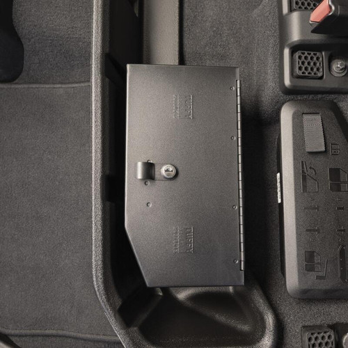 This high security welded steel lockbox mounts under the rear seat in your 2020-2024 Jeep Gladiator. The compact form of the Tuffy lockbox can be discreetly installed within the OEM plastic fence and has sufficient lockable storage to conceal valuables best left unseen to prying eyes. Its secured contents are easily accessed by flipping the driver's side rear seat up and opening the secured lid. Tuffy's Pry-Guard Locking System with a 10 tumbler double bitted security lock with built in weather seals will keep your valuables secure while you enjoy your adventures.