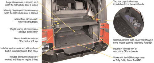 This security deck enclosure creates a large and lockable storage area completely protected on all sides. It works in conjunction with the vehicle rear door and lock (power lock switches become disabled after approximately 16 seconds when locking doors with the key fob). The lid easily hinges open and is secured shut using an innovative latching system. The lid and front can be easily removed without tools so larger items can be transported when required. The unique lid design is constructed from structural welded steel which incorporates a large weight bearing tray for organizing and transporting items on top. There are also two large trays on each side above the wheel well for addition storage and organization. Any items stowed on top of the enclosure must also be securely fastened to the vehicle. The entire Tuffy deck enclosure is constructed using welded 16 gauge steel, heavy duty fasteners, and finished with a durable textured powder coating.