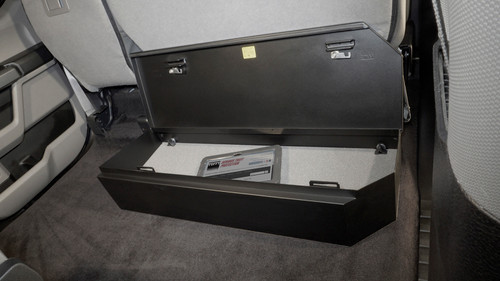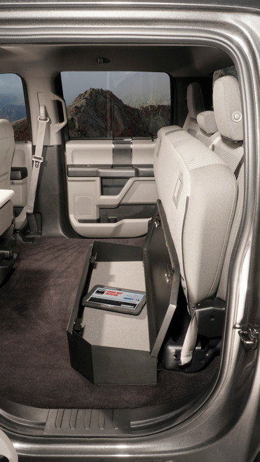 This high security welded steel security lockbox mounts under the rear 60 percent bench seat in your 2015-2024 Ford F-150 or 2017-2024 Ford F-250/F-350/F-450 Super Duty SuperCrew truck. The three-fifths width formfitting design of the Tuffy lockbox has over 3800 cubic inches of lockable storage while leaving room for an aftermarket sub-woofer or other gear under the rear passenger side seat. Its secured contents are easily accessed by flipping the 60 percent rear bench seat up and lifting the lid. The unique design allows the space beneath the 60 percent bench seat to be used to stow firearms or other long items securely. This lock box comes standard with Tuffy's Pry-Guard Locking System and a 10 tumbler double bitted security lock with built in weather seals. Chamfered corners are incorporated into the design for easier passenger access and a more concealed form factor. The innovative mounting system is accessed from inside the box.