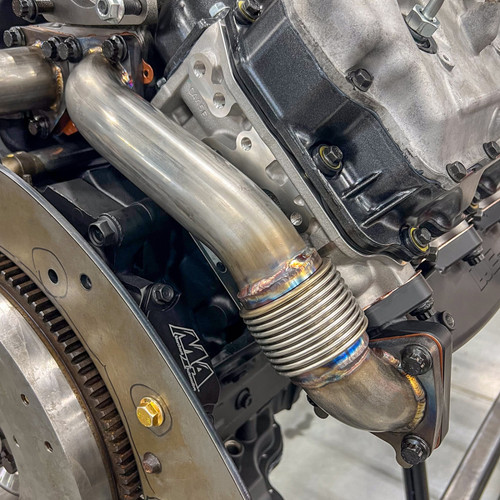Replace the lightweight, leak-prone passenger side OEM up pipe with this heavy-duty 11 gauge 2" Stainless up pipe. HD Stainless Bellows that will not crack and leak like OEM. Increase Turbo spool-up and decrease EGTs. This up pipe is built with more sweeping, less aggressive bends for use in COMPOUND / TWIN TURBO STYLE APPLICATIONS ONLY. It WILL NOT clear a conventional downpipe behind the engine off of the turbocharger in the valley. - - Compatible with only factory exhaust manifolds or WCFab Duramax Billet Exhaust Manifolds (WCF100363). - - NOTE: This up pipe will ONLY fit with OEM exhaust manifold.