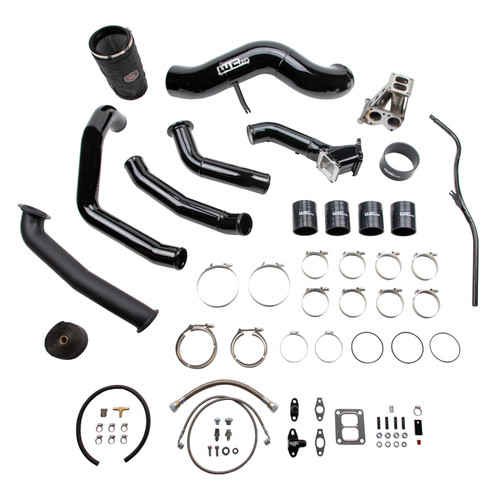 This big single turbocharger install kit from WCFab for 2001-2004 Chevy Silverado 2500 / 3500 HD trucks contains what you need to swap from your stock IHI style turbo to a larger frame Borg Warner S400 style setup on a 6.6L LB7 Duramax diesel engine. Upgrades your existing air cleaner setup to a larger 5" fabricated aluminum intake with heavy duty sheet metal air box and high performance dry filter with pre-filter cover. Intercooler hot and cold side charge pipe plumbing are also updated to high flow 3" diameter mandrel bent 14 gauge aluminum tubes. Includes our upgraded high flow 3" fabricated billet y-bridge kit which replaces the restrictive stock upper intake manifold to finish off the air flow path into the engine and allow for maximum horsepower and efficiency gains. Supplied Oil Lines are high-quality stainless steel braided Parker Lines with the oil feed line routing from the main oil galley on the side of the engine block. A variety of popular turbo size options (sold separately) mount to a T4 fabricated steel pedestal with spacer which is compatible with our 2" high flow stainless steel up pipes.  Included high temp ceramic coated turbo downpipe connects to your existing exhaust front pipe V-Band clamp. This simplifies installation and requires NO cutting or modification to your exhaust system. If you are not purchasing a genuine Borg Warner turbo from us, you must specify the brand and details of what you are using so that our sales team can assist you with placing your order and ensure proper fitment. You may be required to ship a separately supplied turbo to us in advance for mock-up to build your kit. Your order lead time starts when we have the turbo needed to build your kit our possession. Includes Driver Side Transmission Dipstick Tube, making installing the down pipe easier.