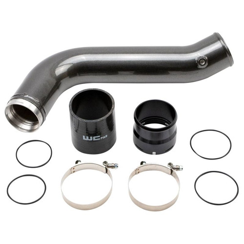 The 3.5" High Flow Passenger Side Intercooler Pipe for 2020 and Newer L5P Duramax replaces the factory plastic two piece pipe with a high flow, 14 ga. aluminum one piece 3.5" pipe. This part uses a CNC machined flange with a double o-ring seal and an upgraded silicone boot with black anodized billet aluminum adapter in order to withstand higher boost pressures than the factory components to increase reliability and eliminate blown factory boots and boost leaks. This pipe is compatible with stock trucks requiring no additional modifications, upgrades, or tuning for installation.