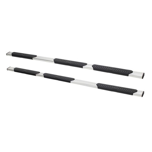 Get a boost, with Westins R5 M-Series Wheel-To-Wheel Nerf Step Bars. The extra wide 5in. footprint step design provides easier and safer vehicle access for both drivers and passengers. Developed and engineered in the USA, the R5 M-Series Wheel-to-Wheel Nerf Step Bars feature three oversized skid resistant step pads allowing easy access to the vehicle cab or truck bed cargo area. Built with high-grade and corrosion resistant steel designed to mount directly to your vehicles existing rocker panels. The modular design saves you money on shipping, as no truck freight costs are required. Also included are injection molded bracket covers for a clean and stylish look. Westins exclusive Isolator Bracket supports the step bar past the truck cab, a feature that competitors do not offer. Without an Isolator Bracket, the step area that extends past the vehicle is left unsupported. Westins unique design provides added bar support without resulting in annoying creaking sounds.