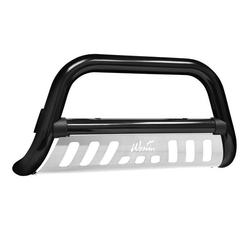 The Westin(TM) Ultimate Bull Bar is a front-end light bar made of 3in. diameter tubing for larger model trucks and SUVs and made of 2.5in. diameter tube for smaller trucks and SUVs. Product application is vehicle specific and comes complete with mounting kit. The Westin(TM)Ultimate Bull Bar features black molded caps on the crossbar welds for a finished and clean look. It features a stainless steel skid plate with a laser-cut Westin signature logo on it. Add a set of Westin(TM) Driving Lights for a complete customized look.