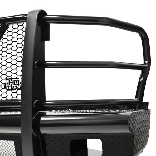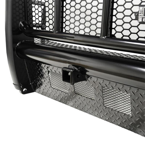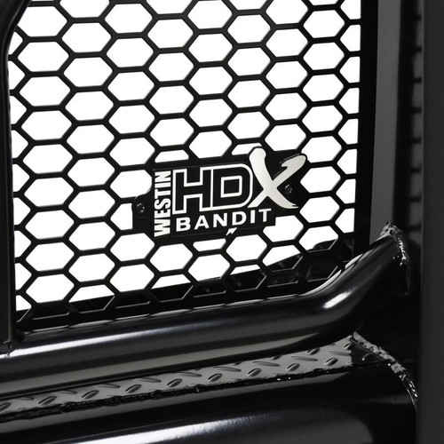 Westins HDX Bandit Bumper combines a heavy duty diamond plate steel bumper constructed of schedule 40 steel pipe with a stylish grille guard featuring 2in. diameter outer wraparound wings and 2 3/4in. wide upright rubber strips. Designed to protect headlights, grille, hood and front fenders from road hazards, debris and wildlife damage. Features a stylish metal honeycomb mesh screen, which allows maximum airflow to the intercooler or radiator area while accenting the front end styling with a clean and rugged look. Removable mesh screens allow for factory camera and adaptive cruise control options available on some late model Ford applications. HDX Bandit Bumper includes a built-in 2in. receiver hitch and (2) heavy duty 9,500 lbs bow shackle mounts, capable of delivering multiple towing options. Compatible for factory fog lamps or LED post mount lights. In addition, some late model Ram and Chevrolet applications feature provisions for factory parking sensors. Bolt-on installation with hardware and mounting brackets included. Available in black powder coat finish.